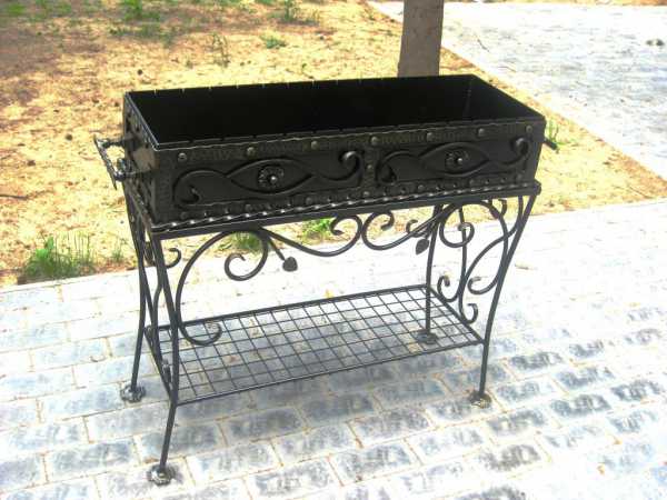 Обычный мангал для дачи квадратной конструкции. Хотя и имеет большой вес, может переноситься. Зачастую ножки съемные. На фото показан один из красивых домашних мангалов для дачи, изготовленный умельцем своими руками
