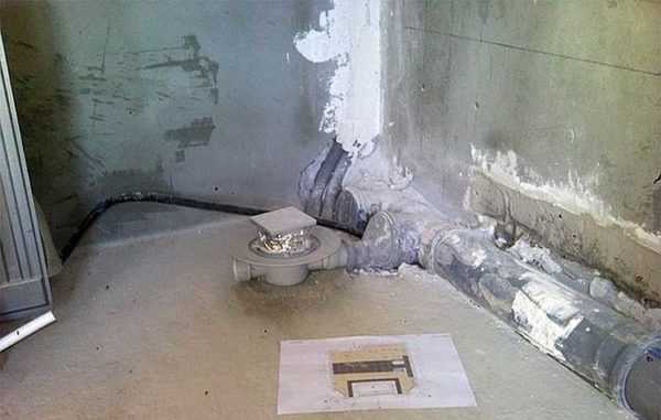 Устройство сантехнической системы для сливаПоверх стяжки укладывается гидроизолирующий слой.