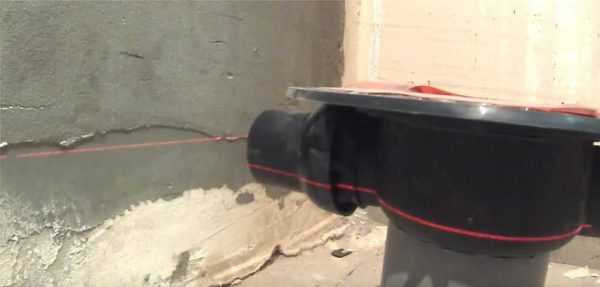 Первым делом выводят от канализационного стояка отвод, куда будет стекать вода. Канализационную трубу кладут с требуемым уклоном (2 см на 1 метр), раструб располагают в предполагаемом месте подключения трапа. После того как канализационный выход установлен, берут трап, делают предварительную разметку — надо на стенах душевой кабины отметить высоту стяжки: