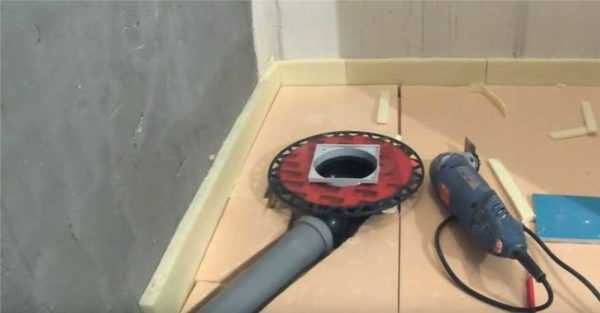 Далее укладывается утеплитель, сверху которого выполняется бетонная стяжка. Монтаж стяжки ведут с наклоном к воронке трапа. Высота стяжки в районе устройства должна быть равна высоте трапа минус толщина керамической плитки и слоя клея.