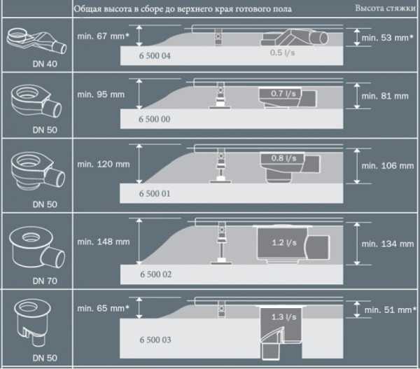 Выбирать стоит и высоту трапа. Минимальное значение — порядка 6-7 см, максимальное — до 20 см. Из технических характеристик данное оборудование имеет только максимальную пропускную способность — сколько литров оно в состоянии отвести в минуту времени. Подбираете в зависимости от максимального напора, который может выдать ваш душ: пропускная способность сливного трапа не должна быть меньше чем максимальное количество выдаваемой воды. Оба параметра измеряются в литрах в минуту (л/мин), так что проблем быть не должно.