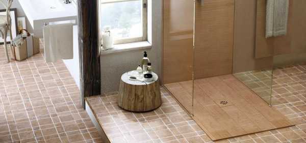 - Сделать плоский деревянный пол на лагах, а с уклоном уложить плитку за счет разной толщины клея. Этот вариант хорош на маленьких площадях — если слив делаете исключительно в душевой кабинке небольшого размера.