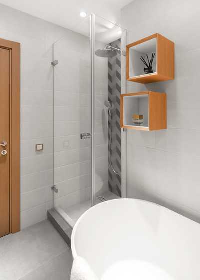 Во-вторых, такой душ можно сделать под свои габариты или встроить в острый угол. Если в ванной теплый пол, то даже шторки не потребуется — разлетевшиеся брызги быстро высохнут. Можно даже попробовать узаконить конструкцию — перегруз плиты перекрытия исключен, стены закрыты стеклянными «шторками», осталось продумать быстрый доступ к сливной арматуре.