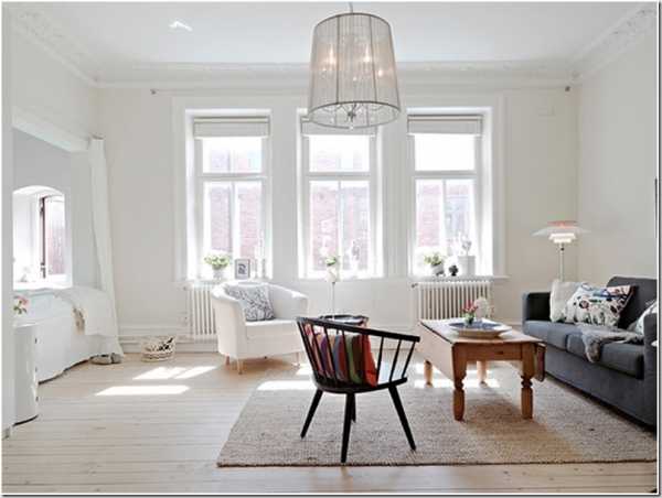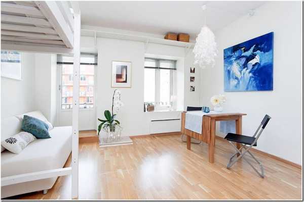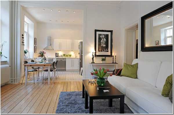 Идеальным решением для оформления дизайна однокомнатной квартиры является скандинавский стиль, который способен привнести в дом яркий свет. Данный стиль предполагает белые стены с неброскими полами, выполненными из паркетной доски или светлого ламината, а также светлую обивку мебели.