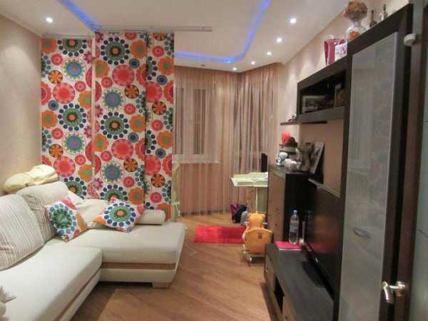 Зонировать помещение можно с помощью перегородок, которые будут делить пространство на родительскую и детскую зону. В качестве таких перегородок могут выступать шторы, которые днем можно прятать в специальных нишах. В роли таких ниш могут выступить два стеллажа с книгами, торцы которых можно оформить зеркалами, благодаря чему пространство будет значительно расширено визуально. Телевизор можно разместить над обеденным столом на кронштейне, благодаря чему хозяева квартиры смогут сидя на диване смотреть любимые передачи.