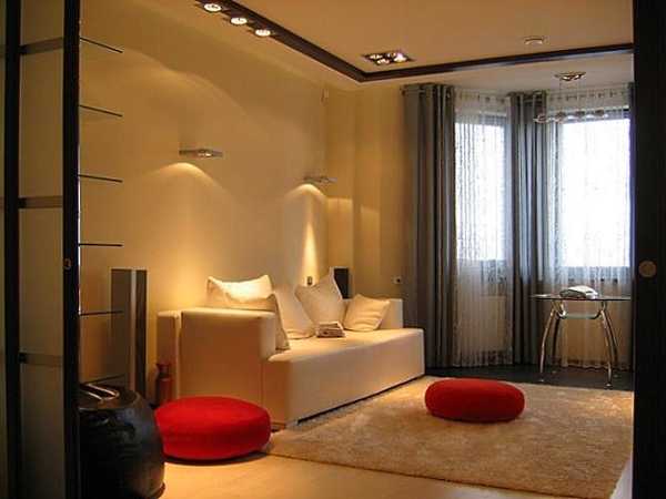 Тоже касается и света. Темная однокомнатная квартира – не вариант. Хорошо, если ваша комната большую часть дня освещается естественным солнечным светом. Но, погода переменчива, да и запастись источниками света точно не помещает. Света никогда не бывает много. Мы рекомендуем вам избавиться от центрального источника света – всеми полюбившейся люстры и приобрести светильники (настенные или для потолка). От них света ничуть не меньше, а вдобавок вы получаете регулировку света, что опять подчеркивает зонирование комнаты.