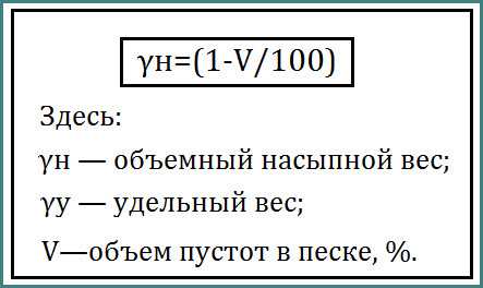 Существует определенная зависимость между пустотностью, удельным весом и объемным. Выражается она такой формулой.