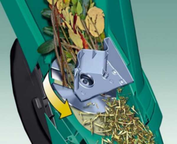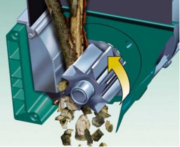Во время работы двигателя, крутящий момент, через цепь или ремень, передается на вал. Расположенные на них ножи перемалывают ветки, которые подаются через приемный короб. Образуется измельченная древесина, которая помещается в компостную яму. Принцип действия напоминает работу мясорубки.