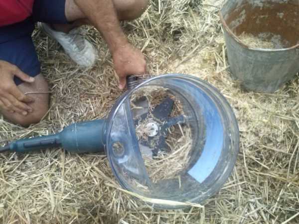 При вращении нож не должен задевать стенок емкости. Внутрь засыпаются ветки и болгарка включается на минимальные обороты.