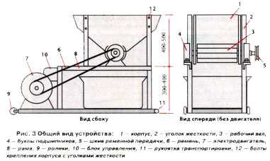 Как уже отмечалось ранее, конструкция измельчителя состоит из двигателя, вала с ножами, рамы, приемного короба и защитного кожуха. Но это лишь общий вид и, как говорится, дьявол кроется в деталях. Создавая чертеж измельчителя, необходимо уделить особое внимание расположению вала с ножами, а также углу среза ножей.