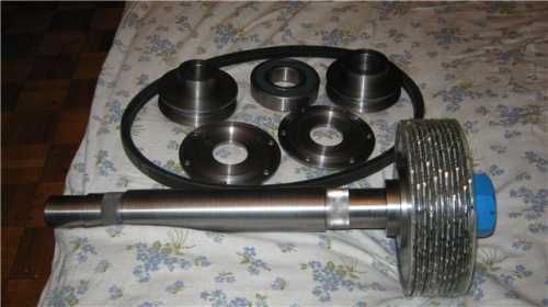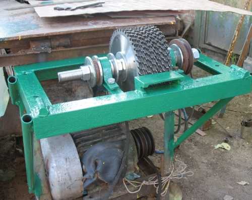 На раме размещается шпилька с дисковыми пилами, которая приводится в движение мотором. Чаще всего в таких конструкциях используется ременной привод. Поэтому на конце вала двигателя и шпильки размешаются шкивы. Размер шкивов может быть одинаковым. Ниже приведены чертежи такого измельчителя.