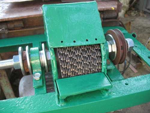После сборки измельчительного барабана надеваем на валы шестеренки и устанавливаем всю конструкцию на раму, где закрепляем ее болтами. После чего ставим на место двигатель и натягиваем приводную цепь или ремень. В завершение устанавливаем и закрепляем приемный короб. А также устанавливаем защитный кожух на все вращающиеся части измельчителя во избежание случайного попадания сторонних предметов.