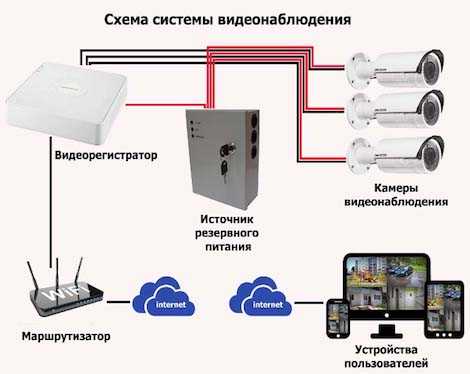 Когда коммуникации готовы, приходит черёд установки камер в соответствии с разработанным планом. Схема подключения показана на рисунке.