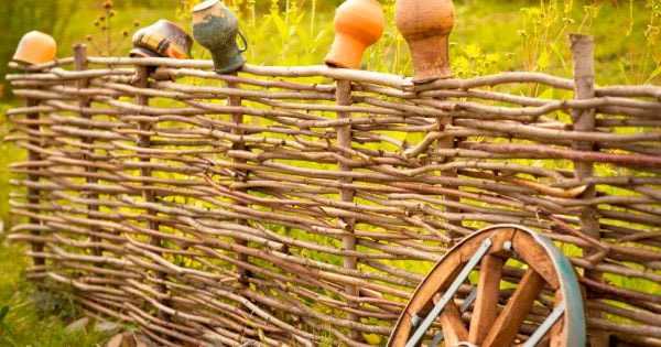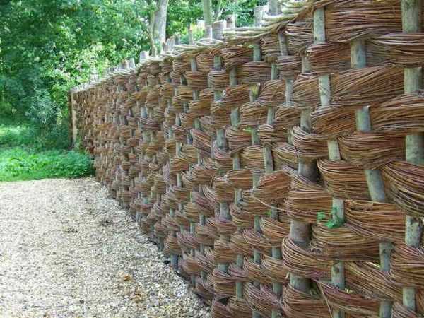 Большинство жителей частных домов стали проявлять повышенный интерес к плетеному ограждению. Такая изгородь способна не только подчеркнуть привлекательность ухоженного участка, но и поднять статус всего архитектурного ансамбля жилища, добавляя индивидуальный колорит местности. Это ограждение изготавливается из прутьев лозы, которые горизонтально обвивают вертикально установленные столбы.