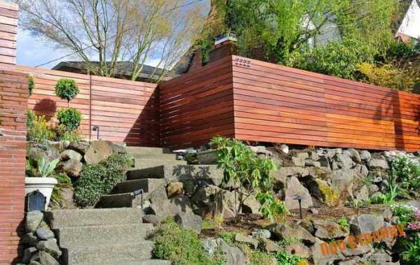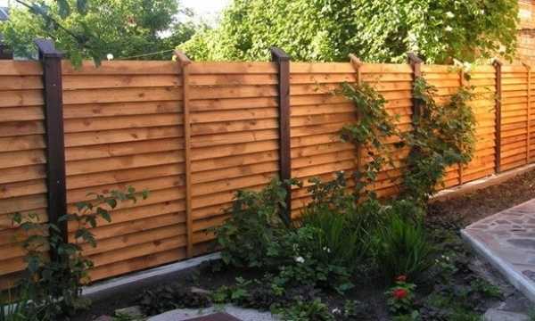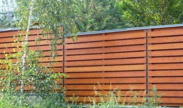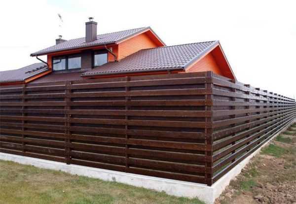 Идеальный вариант ограждения частного дома, расположенного недалеко от дороги, так как помогает защитить участок от газа, пыли и посторонних взглядов. Эта разновидность сэкономит на доске, поскольку небольшие зазоры уменьшат объем материала. Горизонтальные доски, скрепленные в виде лесенки, придают изгороди оригинальный вид.