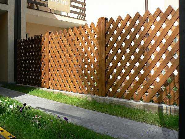 Каркас конструкции может обладать как прямоугольной, так и квадратной формой, на который под специальным углом нужно прикрепить рейки. Затем вторым рядом закрепить перпендикулярные столбы, образующие сетку. Смотрится такая изгородь очень привлекательно.