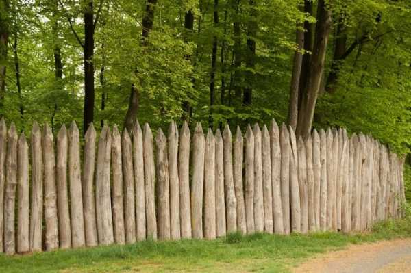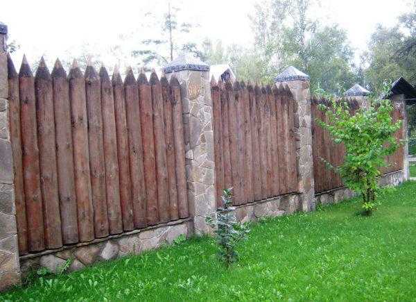Разновидность этого забора имеет неповторимый внешний вид и характеризуется повышенной прочностью. Представляет собой колья, заострённые под углом 30-45 градусов, вкопанные в грунт и закреплённые между собой поперечинами. Часто для пролетов используют оцилиндрованные бревна, что устанавливаются между кирпичными опорами.