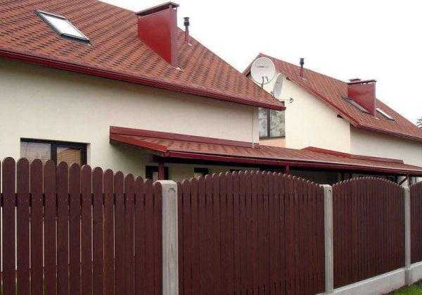 Цветовая гамма панелей довольно широка: можно выбрать односторонний и двусторонний окрас, цвет, имитирующий дерево разных оттенков (например, темный и светлый дуб), и другие варианты. Забор из евроштакетника может повторять цвет сайдинг-панелей вашего дома или цвет кровли, создавая стилевое единство.