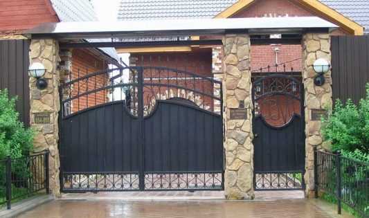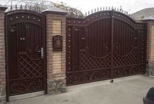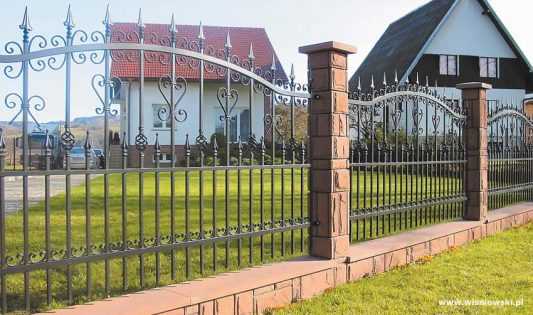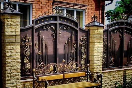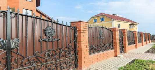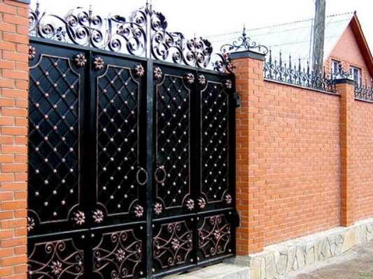 Один из множества возможных дизайн-ходов при устройстве кирпичного забора — его сочетание с коваными воротами.