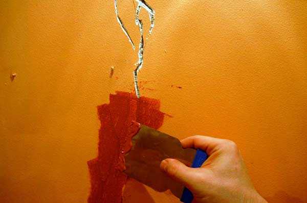 В первую очередь заделывают выемки и трещины. Сначала углом шпателя трещины расширяются, удаляя все, что может отвалиться. Затем их покрывают грунтовкой (окунуть кисть в состав и хорошо смочить) и после ее высыхания наносят шпаклевку, выравнивая ее с плоскостью стены.