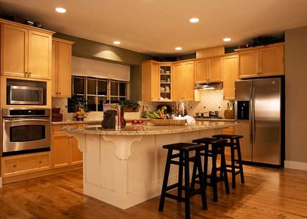 Точечное освещение на кухнеВ ходе электролюминесценции происходит перемещение электронов внутри диода, формируется фотонная энергия. Элементарные частицы электромагнитного излучения — поток света, которым обладают уличные светодиодные и домашние потолочные светильники.