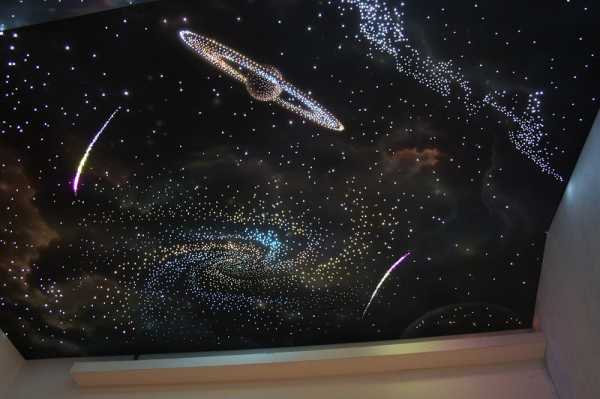 Освещение в виде звездного неба прекрасно подойдет для монтажа в детских комнатах. Такое световое приспособление обладает притягательным для глаза видом. Их ставят в ресторанах, торговых центрах, а также саунах, ведь этот электроприбор не боится повышенной влажности.