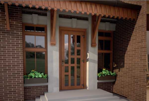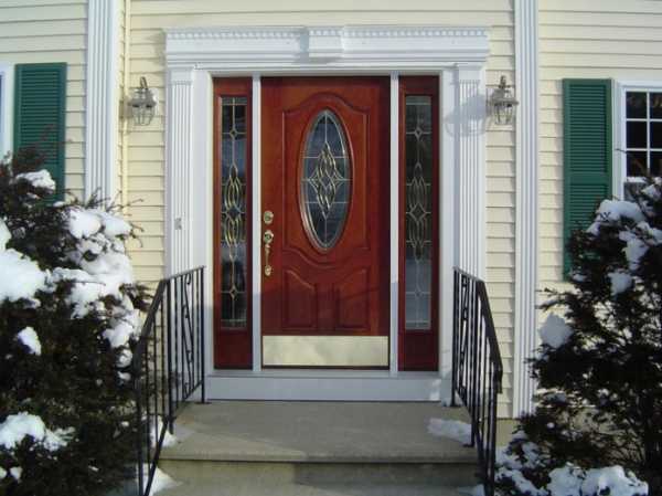 - Входная дверь со стеклом является настоящим украшением фасада дома.