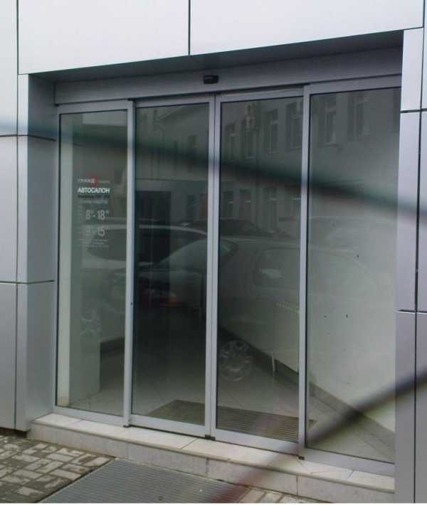 Двери раздвижной конструкции обычно устанавливаются в гипермаркетах и крупных торговых центрах. Они обладают значительной пропускной способностью и не занимают много места. Близкими к раздвижным по способу открывания являются телескопические системы, также перемещающие по направляющим, но при этом в одной связке может быть установлено сразу несколько секций. По рельсам также могут передвигаться и полукруглые конструкции остекленных дверей.