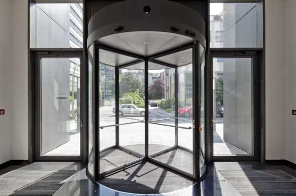 Наиболее функциональными остекленными дверными конструкциями считаются револьверные системы, с помощью которых пространство разграничивается на несколько зон. Вращение створок осуществляется благодаря наличию центрального овала и может быть осуществлено как автоматическим способом, так и механическим. Револьверные системы различаются по количеству створок которых может быть две или четыре.