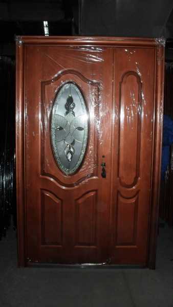 На металлические двери со стеклом частенько закрепляют внешние накладки: из натурального дерева, мдф, ламината и т.д. Поэтому иногда их относят к деревянным дверям.