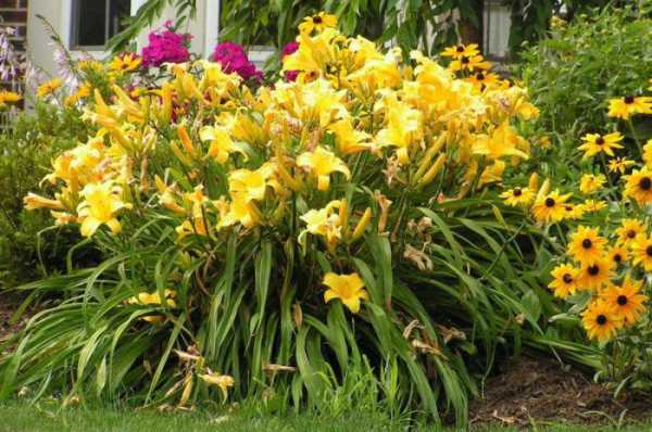 Если вам нужно добавить солнечных красок, то обратите внимание на сорт Hyperion, один из самых старых и популярных сортов лилейника. Это стойкий цветок с желтыми цветками и восхитительным ароматом. На фото ниже лилейник и рудбекия красиво соседствуют в солнечной композиции.