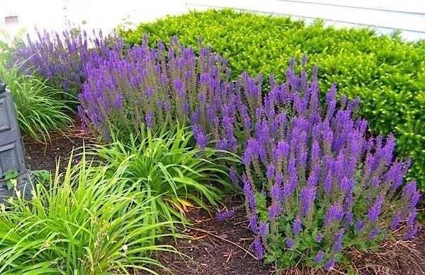 Свечеподобные соцветия шалфея разных оттенков фиолетового прекрасно дополнят миксбордеры, наполняя сад ярким ароматом. Цветение длится все лето, при этом низкорослые кустики всегда остаются декоративными без дополнительных манипуляций со стороны цветовода. К типу почвы и плодородию неприхотлив, но не переносит переувлажнения. Может расти в полутени, но лучше чувствует себя на солнечной поляне.