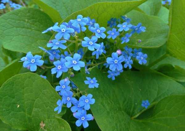 Среднерослые кусты бруннеры с темно-зелеными крупными листьями уже в начале мая усыпаны мелкими голубыми цветочками с белой сердцевиной. Оптимальные условия для хорошего роста — питательные влажные суглинки в полутени крупных кустарников и деревьев. Также бруннера неплохо растет вблизи водоемов. Быстро разрастается, не требует пересадок и омоложений. Отличается высокой зимостойкостью.