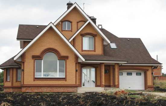 Красивый дом из красного кирпича с окнами нестандартной формы.