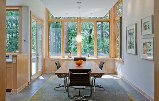 - Если в доме планируется кабинет, то для установки подоконника более всего подходит высота 750 мм, соизмеримая с высотой рабочего стола, расположенного рядом. Такой прием визуально делает рабочее место шире. Если расположение стола иное, посадку окна можно снизить до 650 мм, что существенно увеличивает поток света.