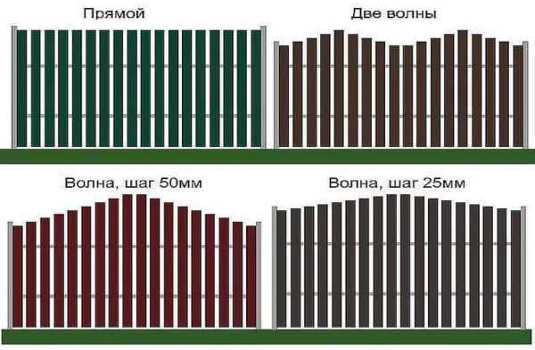 Есть еще несколько разновидностей заполнения пролетов (расстояния между опорными столбами). Проще всего в монтаже прямой способ — это когда все планки одной длины. Поверх такой ограды можно пустить П-образную планку из того же материала (продается там же где и евроштакетник). Кроме эстетической нагрузки, она еще прикрывает срезы металла, что увеличивает срок службы забора.