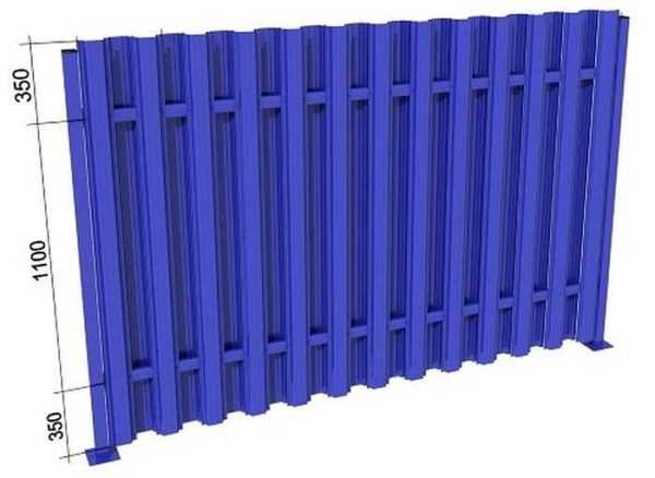 Ширина пролета вертикального забора из металлического штакетника — 200-250 см. Именно на таком расстоянии вкапывают столбы, затем между ними закрепляют две или три поперечины. Эти поперечины называют «лаги» или «тетивы». Для штакетника высотой до 150 см достаточно две поперечины, для более высоких лучше три.