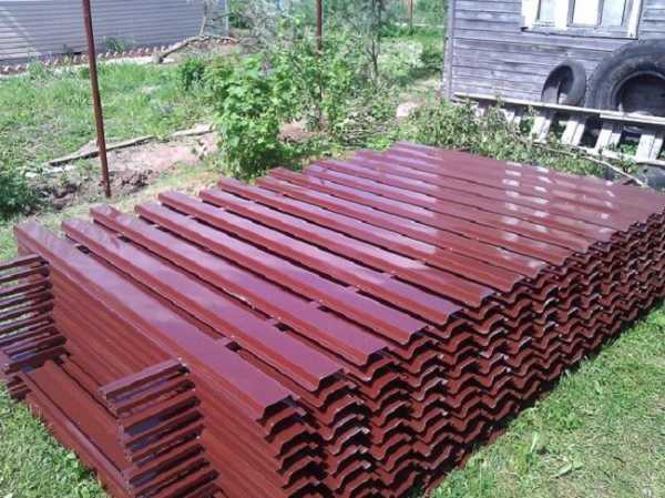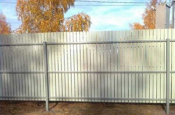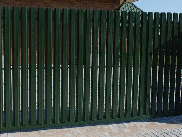 В отличие от классического штакетника, из профнастила забор стоит дешевле. Имеется широкий выбор цветовой гаммы листов. После обработки антикоррозийными средствами такой забор простоит десятки лет. В основу каркаса идет труба с диаметром от 60 до 80 мм. Расстояние между балками варьируется от полутора до двух с половиной метров, в зависимости от высоты и веса листов. К каркасу привариваются горизонтальные планки, после чего всё покрывается специальным составом. Установка штакетника производится с заранее определенной шириной зазора.