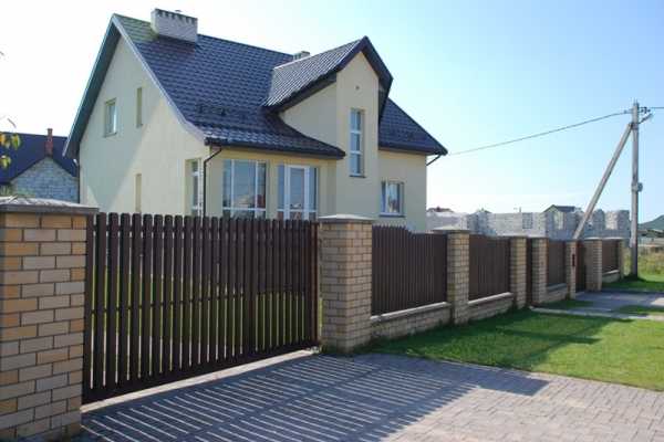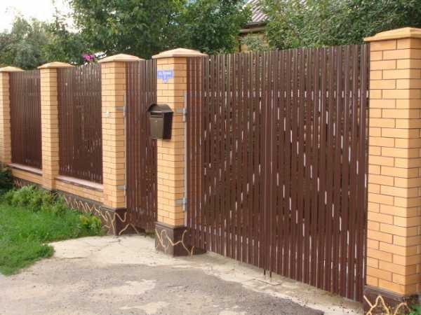 Кроме этого штакетник из профнастила отлично сочетается с другими оградительными элементами из камня, дерева или кирпича. Одним из наиболее удачных решений является сочетание опор из кирпича с установленным между ними металлическим штакетником. Такое ограждение выглядит элегантно и фешенебельно, при этом создаётся ощущение защищённости и устойчивости.