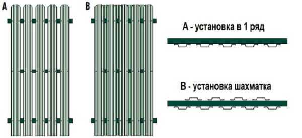 Есть однорядный и двухрядный (двусторонний, шахматка) способ монтажа планок металлического штакетника. При двухрядном, планки располагают с обоих сторон от тетивы, причем так, чтобы они хоть на сантиметр перекрывали друг друга. Поэтому, расстояние между планками должно быть чуть меньше ширины штакетины. При таком монтаже, планок на погонный метр ограды потребуется на 55-60% больше. Зато ограда получается практически непросматриваемой — только под определенным углом можно увидеть небольшую часть площади. И это при том, что ограждение не будет сплошным и все «прелести» сплошного забора вас не коснутся.