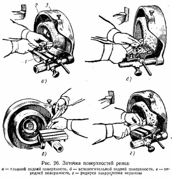 При затачивании резца устанавливаются на подручниках 1 (рис. 26, а). Шлифовальный круг 2 должен быть огражден предохранительным кожухом 3. Порядок заточки следующий: сначала затачивают главную заднюю поверхность (рис. 26, а), затем главную вспомогательную (рис. 26, б) и, наконец, переднюю пверхность резца (рис. 26, в). После заточки этимх поверхностей закругляют вершину резца (рис. 26, г). Во время заточки резцов на заточных станках необходимо соблюдать следующие правила: