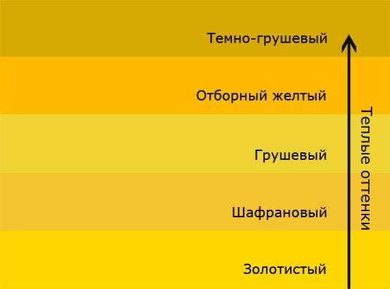 Если обычного человека попросить назвать различные виды желтого, он назовет не больше десятка, однако дизайнеры различают более 130 оттенков, среди которых медовый, сигнальный, канареечный, кукурузный, карри и другие. Все их можно разделить на несколько групп, которые представлены в таблице.