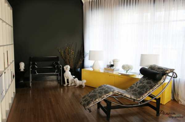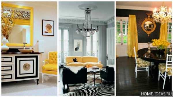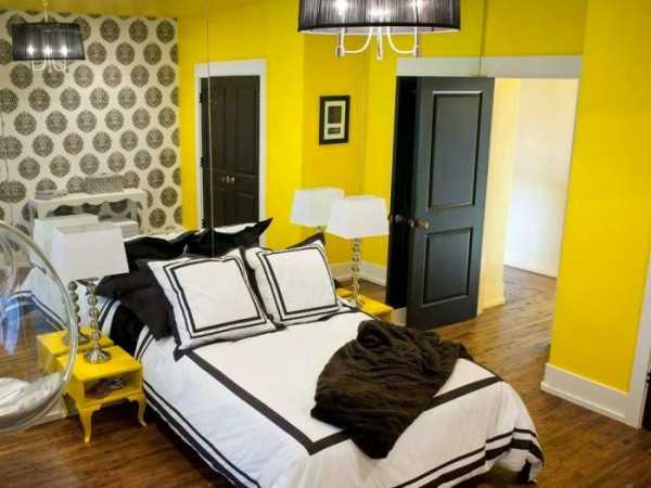 В таком соседстве интерьер будет слишком резким и кричащим, а вот если черно-белый дизайн дополнить желтыми деталями – есть возможность в чопорную и строгую монохромную гамму привнести легкость и воздушность и получить привлекательный и располагающий к отдыху интерьер.