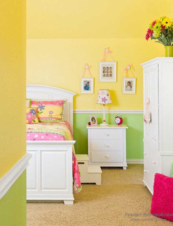 Яркий цвет солнышка любят малыши младшего, дошкольного возраста, он возбуждает и активизирует ребенка, поэтому использование желтых красок рекомендовано для игровой зоны детской, но для спальной желательны более спокойные оттенки, например, синие, серые, зеленые. Правильное дозирование тонов поможет создать в комнате приятный и свежий интерьер.
