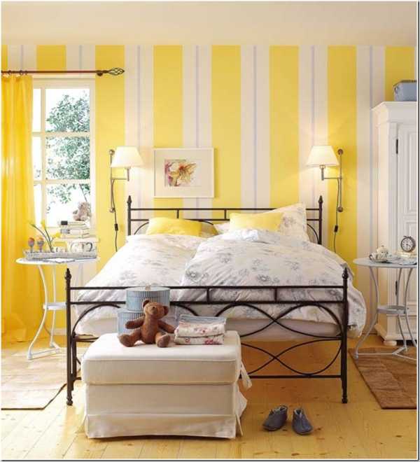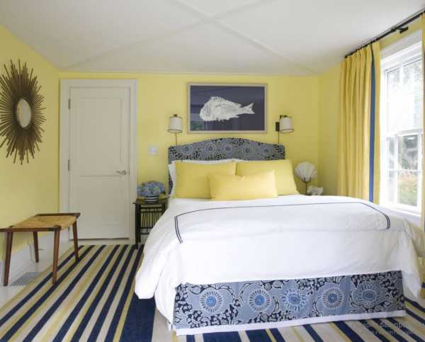 Отличным вариантом для спальной комнаты станут солнечные стены, полосатый ковер на полу. Оконные рамы, двери, предметы декора лучше сделать белыми, а синий использовать в деталях. Так все цвета будут уравновешены.