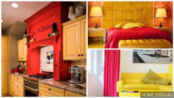 Яркое, контрастное сочетание двух теплых оттенков. Красный так же возбуждает психику, поэтому такой интерьер будет вдвойне бодрящим. Что бы уменьшить негативное влияние на психику стоит приглушить один из тонов. Светло-желтые оттенки будут почти прохладными на фоне яркой красной мебели, а терракотовый, малиновый или цвет красного цикория — благородно смотрятся с насыщенно-желтым.