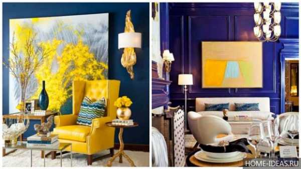 На первый взгляд, странный дуэт– «теплый» желтый и «холодный» синий. Чтобы такой диссонанс не ощущался слишком явственно, лучше использовать не глубокие, а приглушенные тона, причем желтый может доминировать в интерьере, а дополнить их лучше белым.