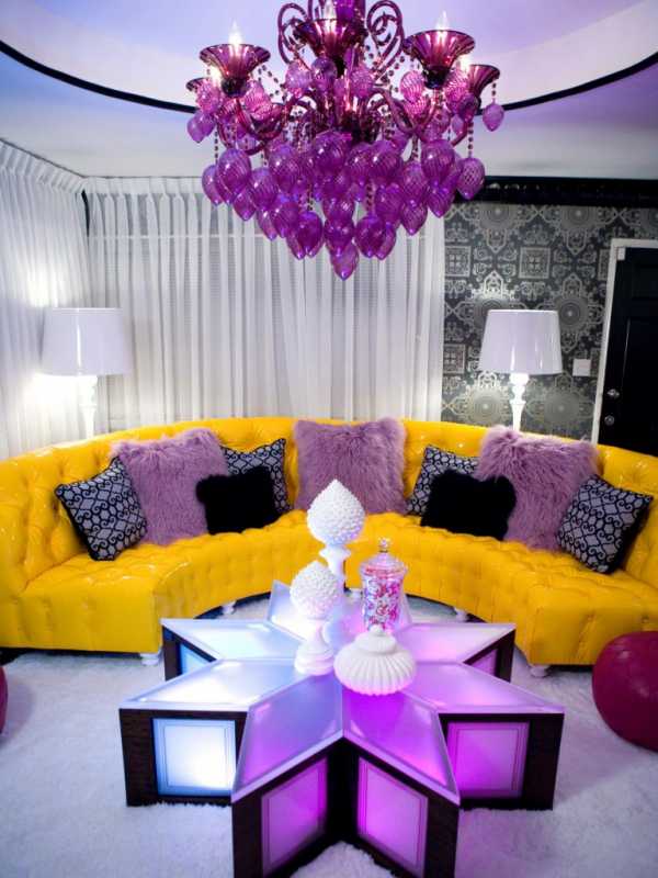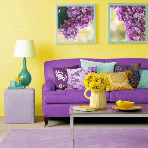 Впрочем, использовать эти цвета в чистом виде в спальне, детской и даже гостиной дизайнеры не рекомендуют. Для помещений, где человек должен чувствовать себя спокойно и расслабленно лучше подобрать светлые оттенки желтого и фиолетового.