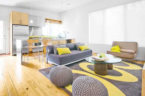 На фоне белых или светло-серых стен хорошо выглядит мебель графитового, антрацитового оттенка, дополненная яркими солнечными или канареечными аксессуарами. Это могут быть диванные подушки, большая ваза, абажуры у светильников. Полосатый ковер на полу завершит оформление.