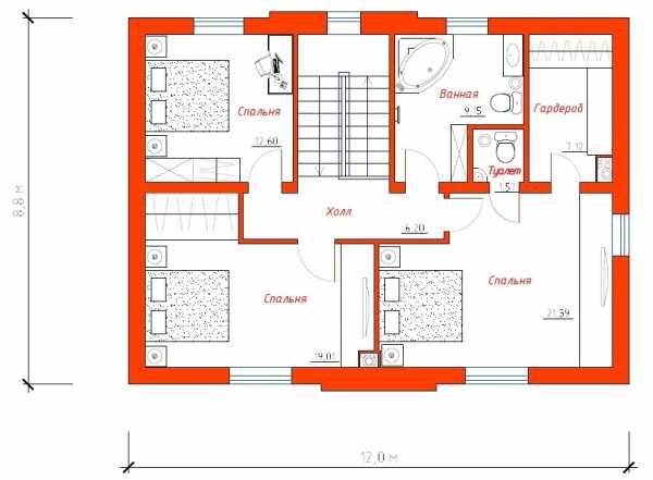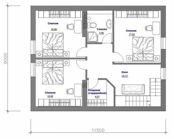 Планировка второго этажа тоже отличается удобством и, возможно, даже лучше, нежели пространственные решения этажа первого. Три спальни, две из которых имеют собственные гардеробы. Можно организовать детскую в одной из них – правильное решение для двухэтажного жилого дома.